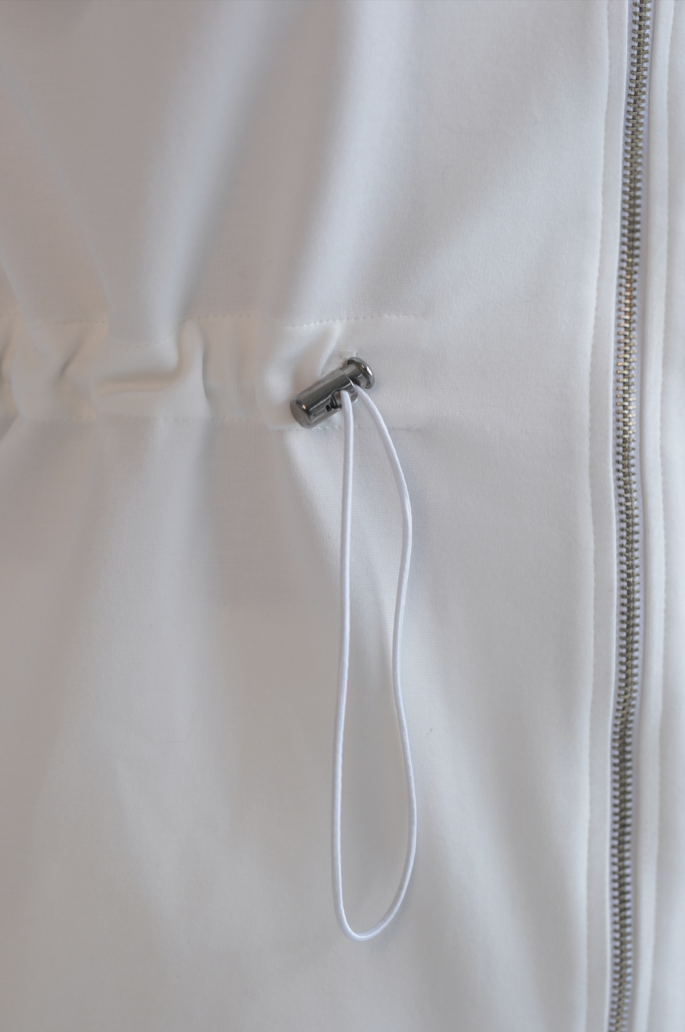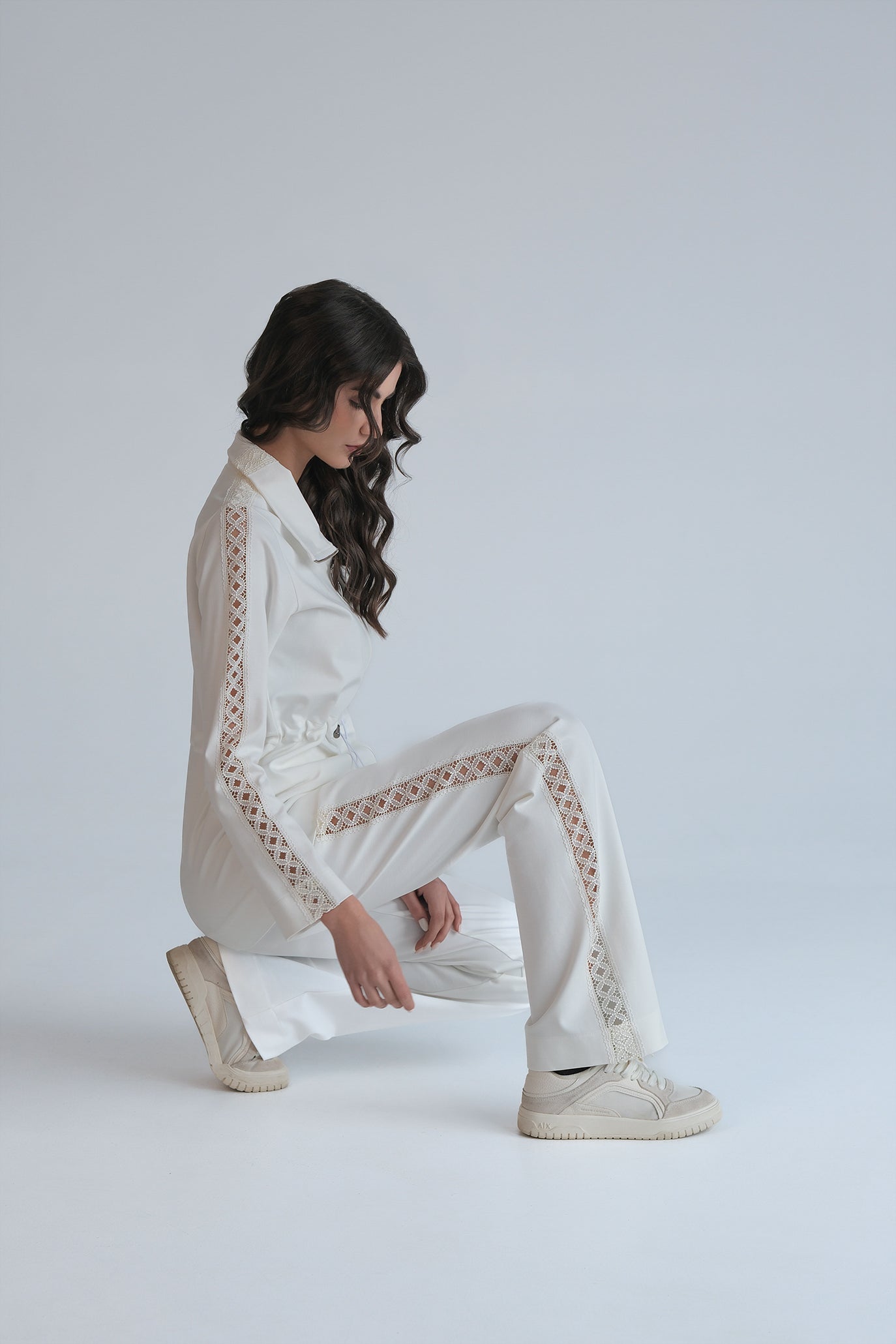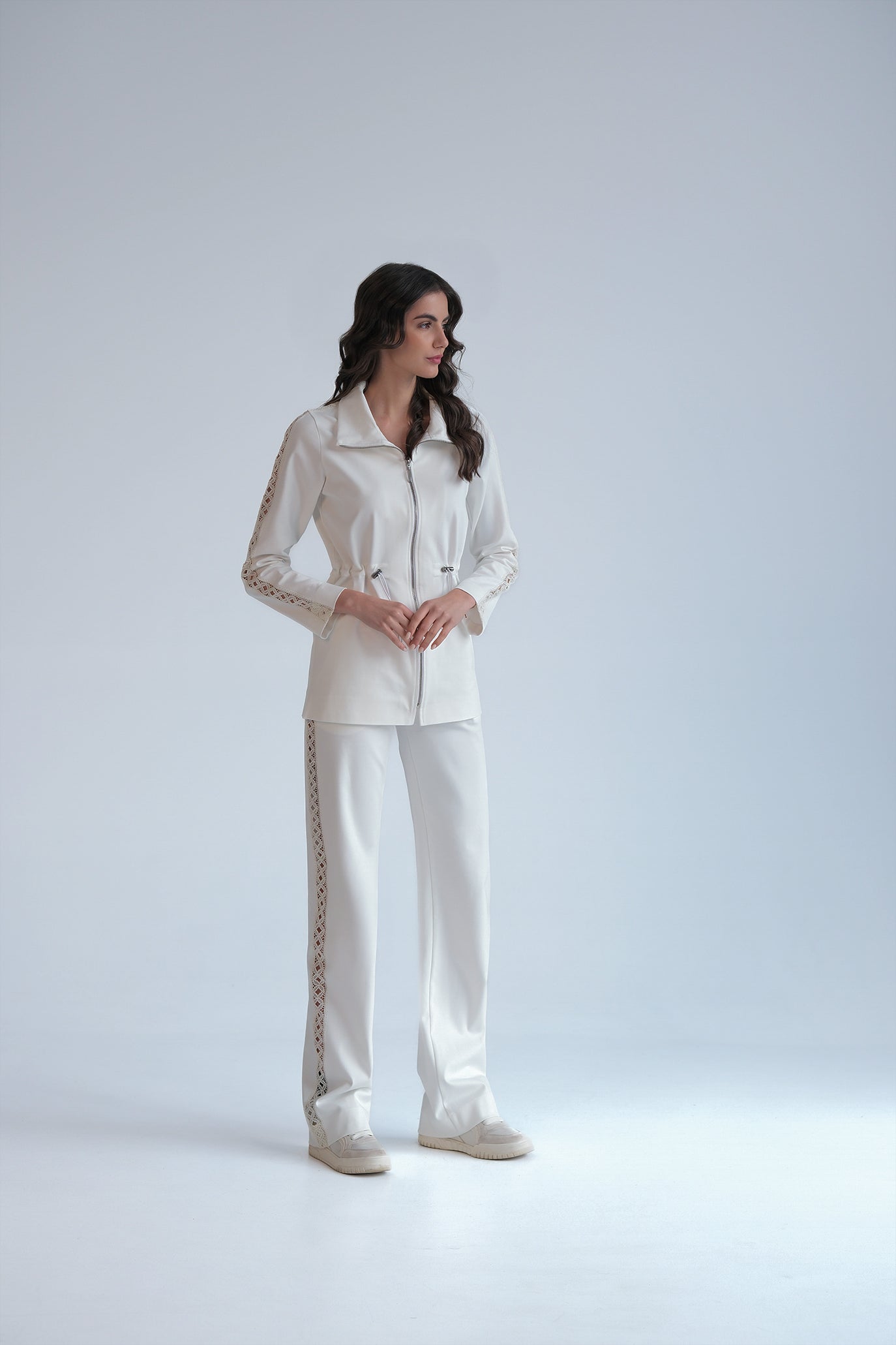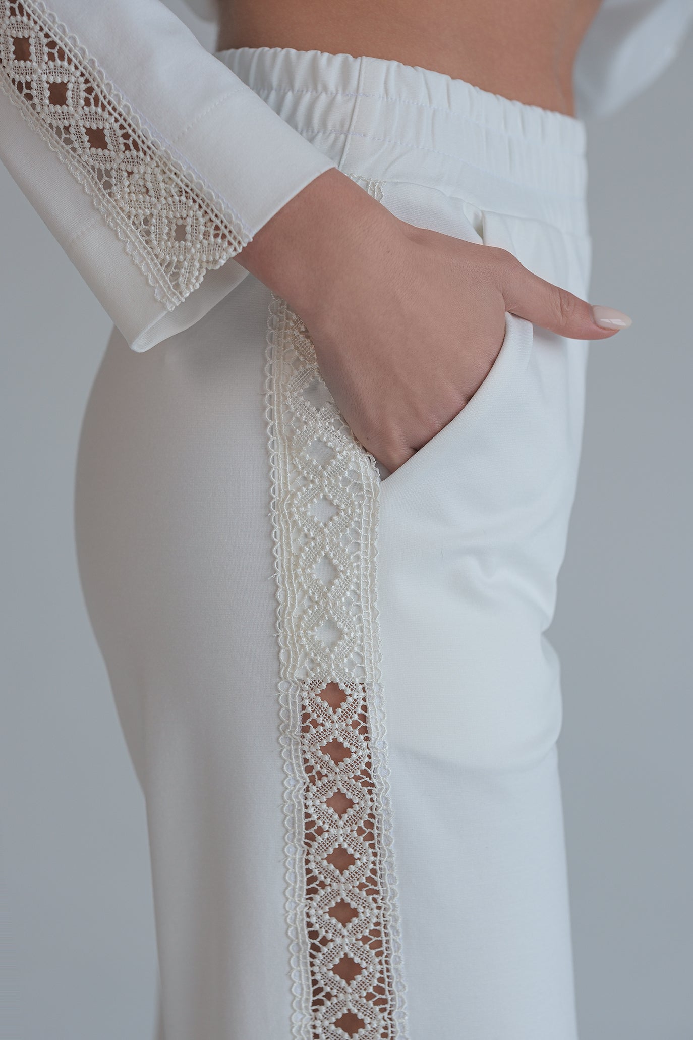 Спортно-елегантен сет от две части, изработен от висококачествена материя с меко и гладко усещане. Горната част е с изчистен силует и регулируема талия чрез фини връзки, които позволяват прецизно оформяне на фигурата. Декоративната дантела по ръкавите придава женствен акцент. Панталонът е с комфортна ластична талия и прав крачол, а деликатната дантелена лента по дължината му визуално издължава силуета. Може да изберете панталон с разкроен крачол тип Чарлстон или по-втален прав крачол.