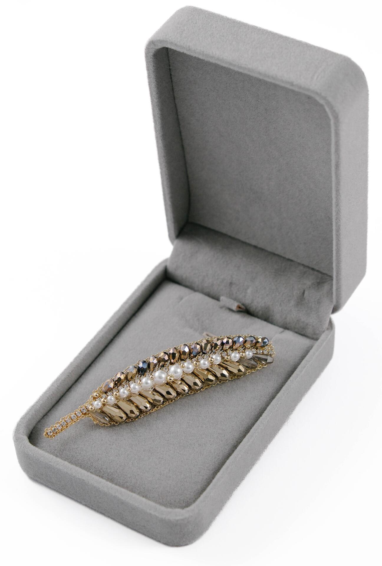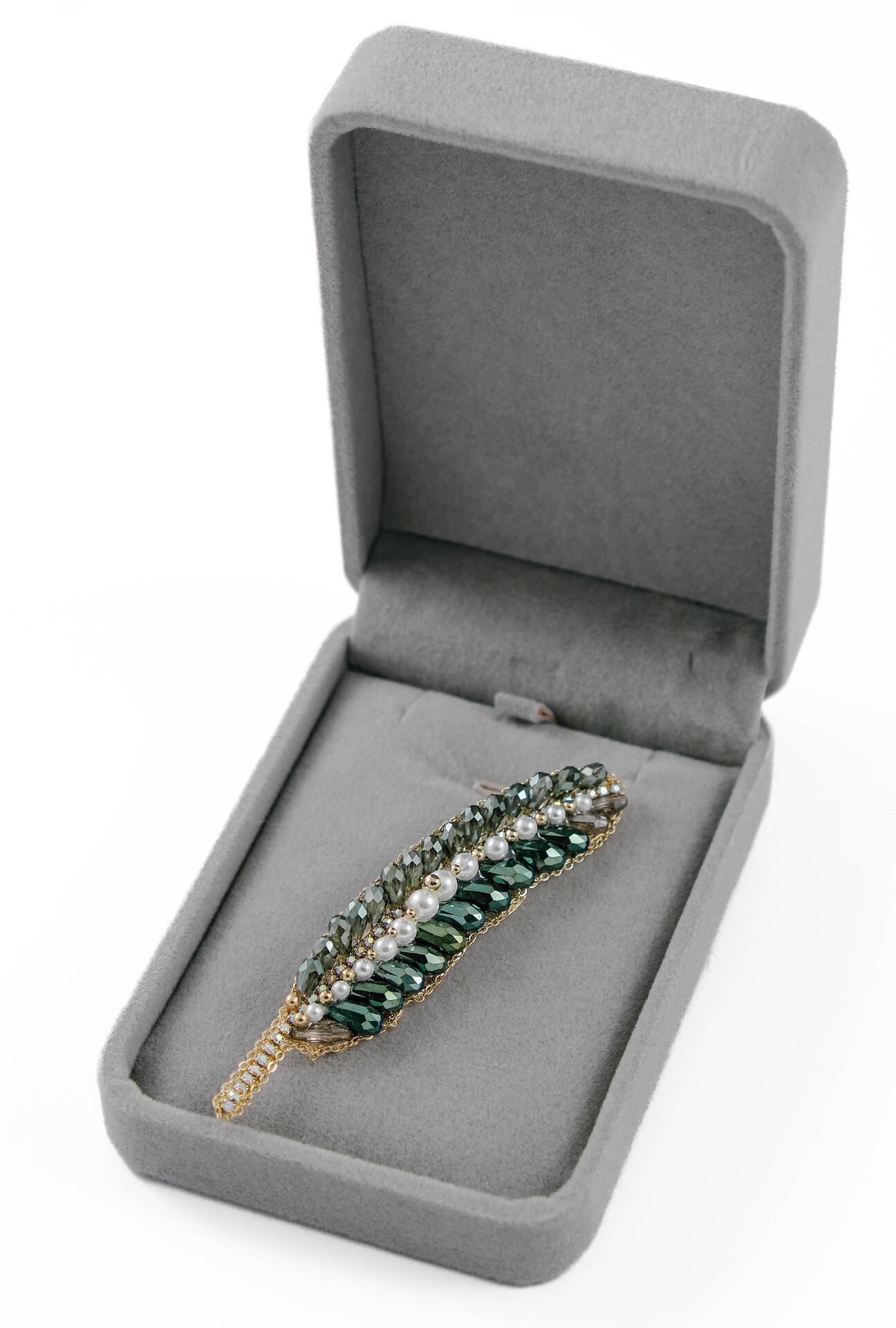 Брошка обсипана с малки златисти мъниста, бели перли и тъмнозелени кристали във формата на перо. Закопчаването е с безопасна игла.