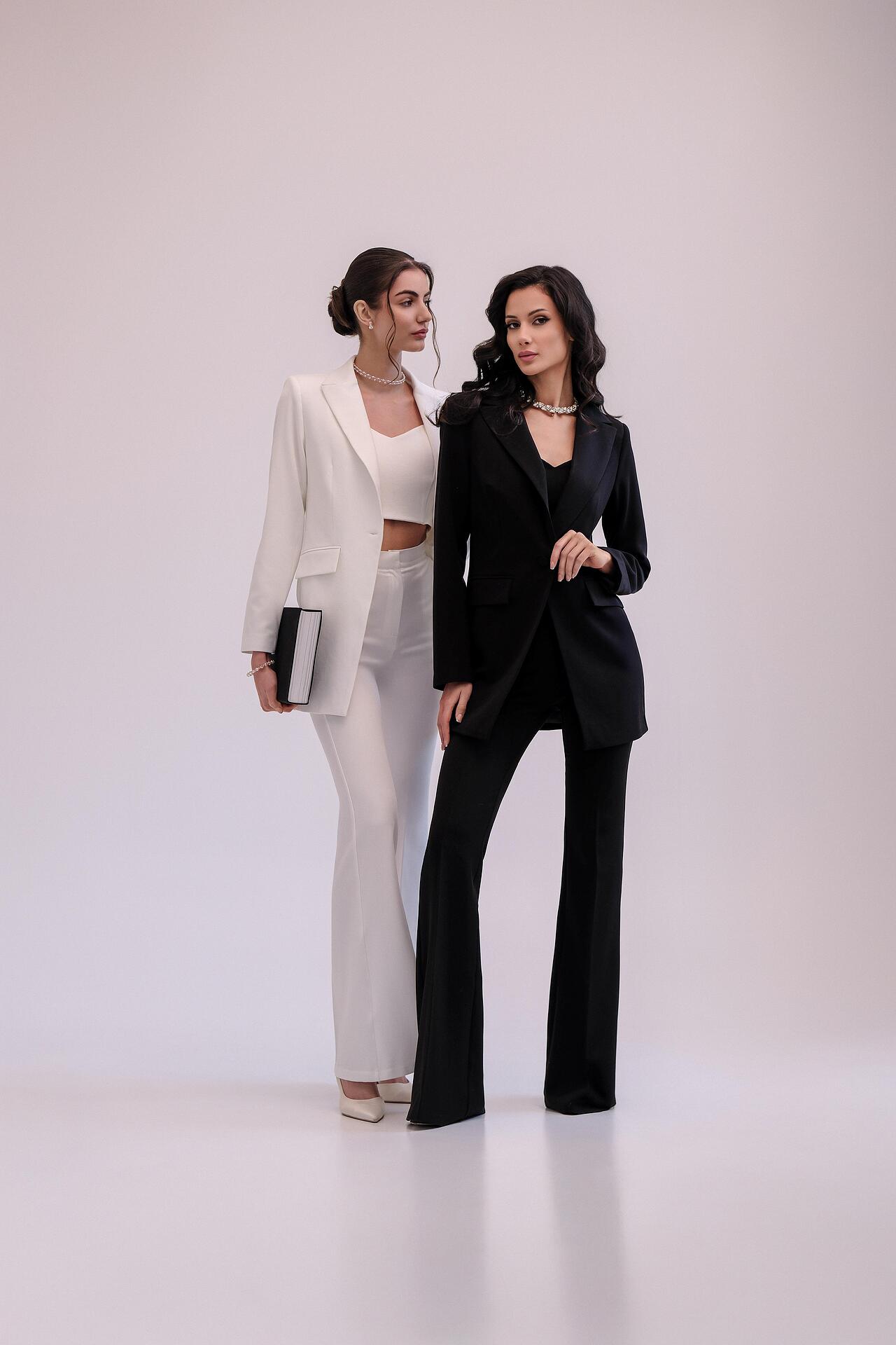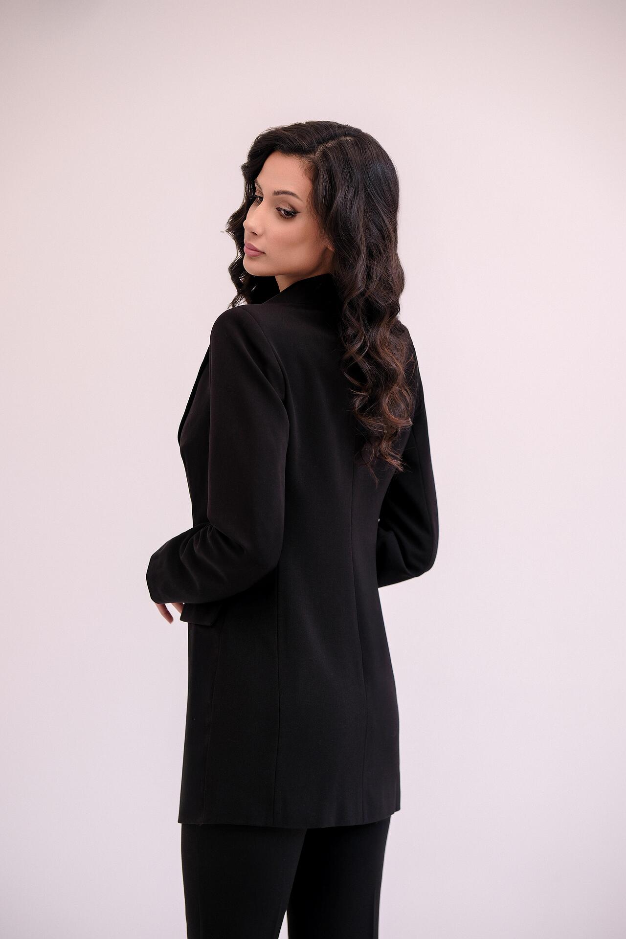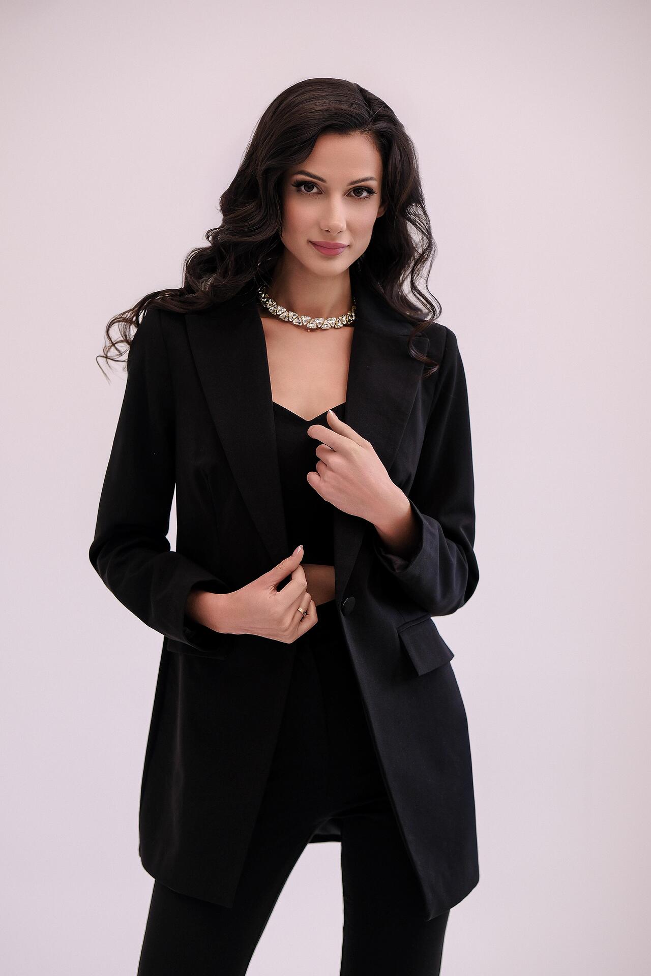 Сако от висок клас на изработка. Кройката е тип овърсайз и леко по-дълго. Има подплата. Може да се закопчее отпред с копчета. Детайлите като декоративни джобове и изисканото закопчаване допълват визията. Идеално за бизнес срещи или стилни вечерни събития.