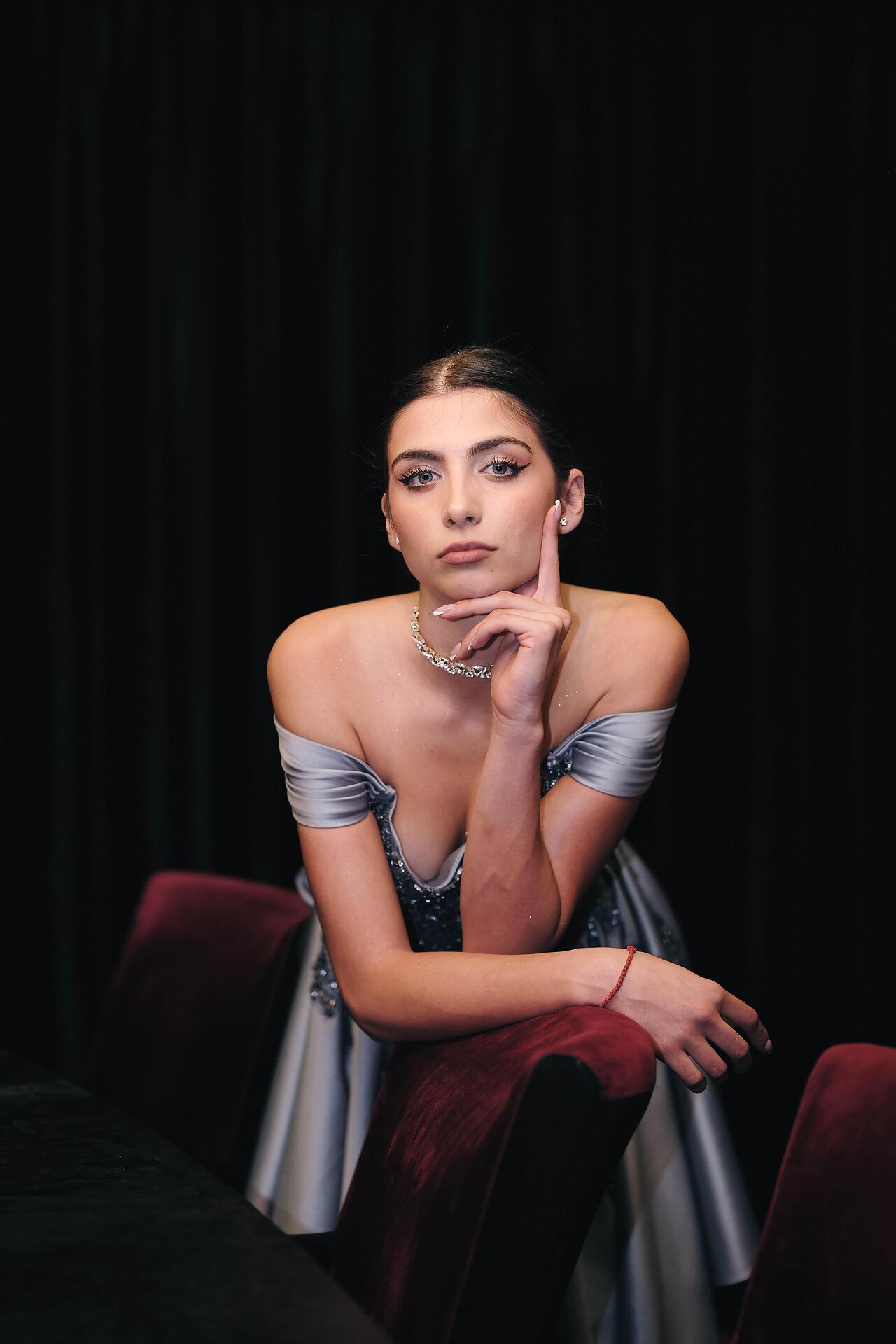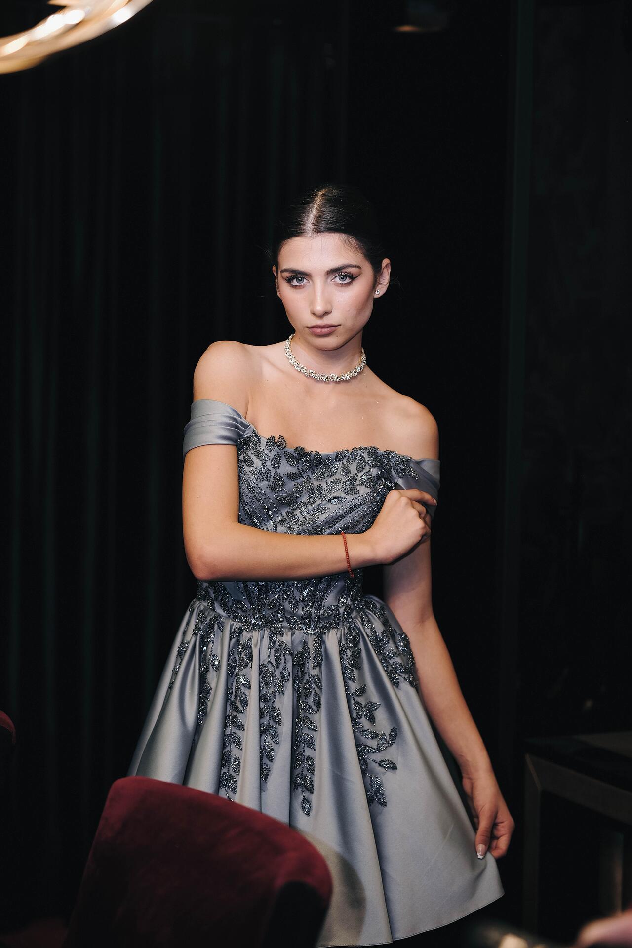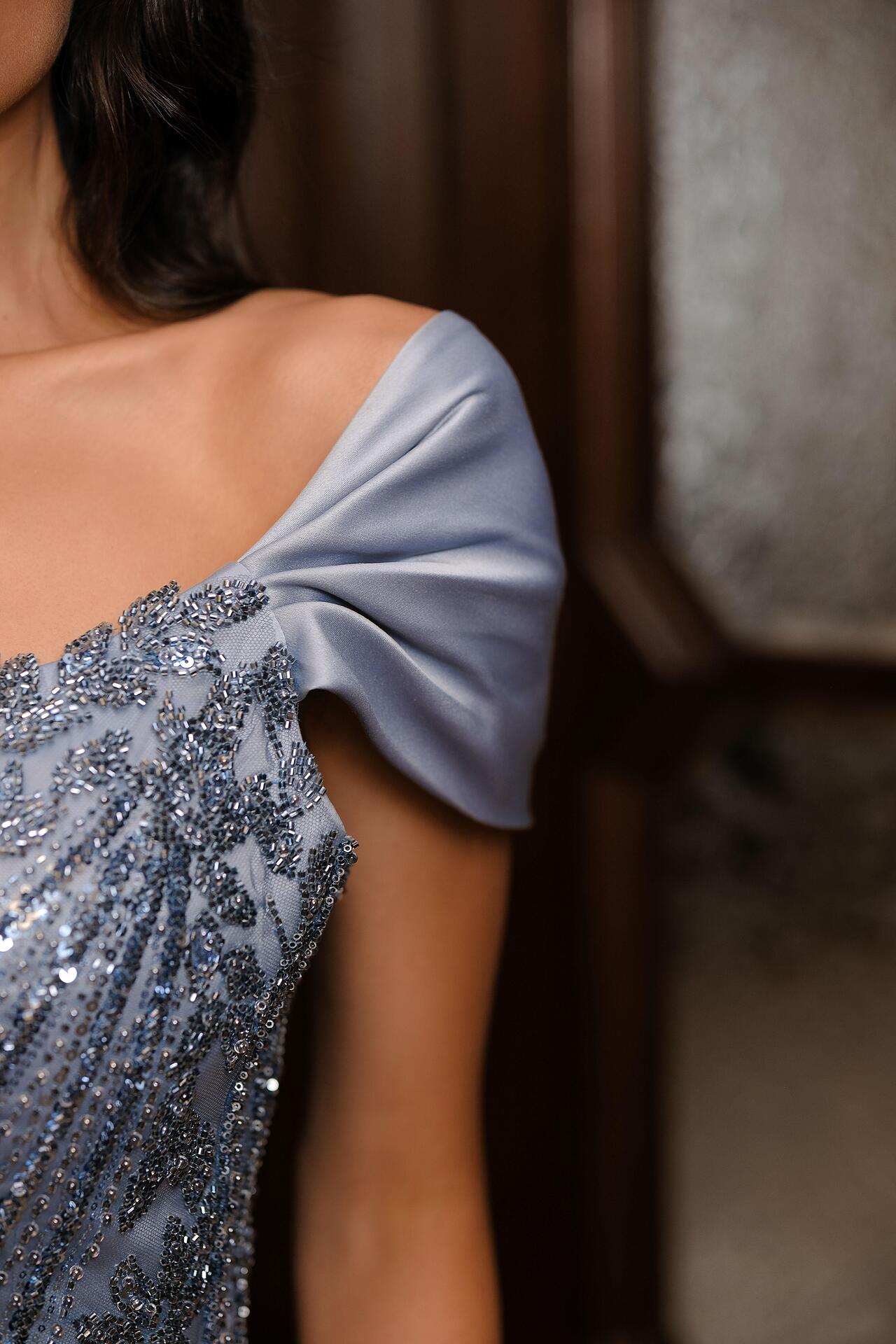Къса рокля, изработена от мек текстил. Горната част е корсетна, с вградени чашки. Размерът може леко да се регулира, благодарение на връзките, с които се пристяга отзад. Корсетната част е ръчно обшита с пайети и ситни мъниста, които деликатно преливат към разкроената долна част, съставена от няколко пласта тюл. Подплатата е тритокажен мек текстил. Платът отгоре е висококачествен руски сатен, който изглежда невероятно плътен и луксозен. Има невероятен отбясък на светлина, а в комбинация с декорациите, ще блестите с всяка стъпка. Падналите широки презрамки добавят нотка романтика. Талията е идеално подчертана. Роклята може да бъде изработена според мерките и предпочитанията за цвят и дизайн на клиента.