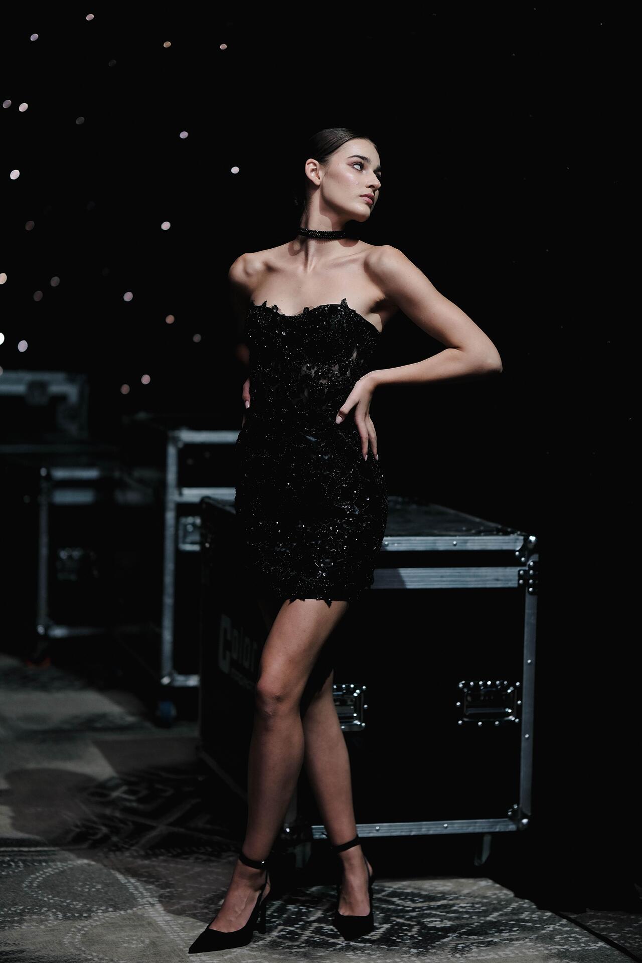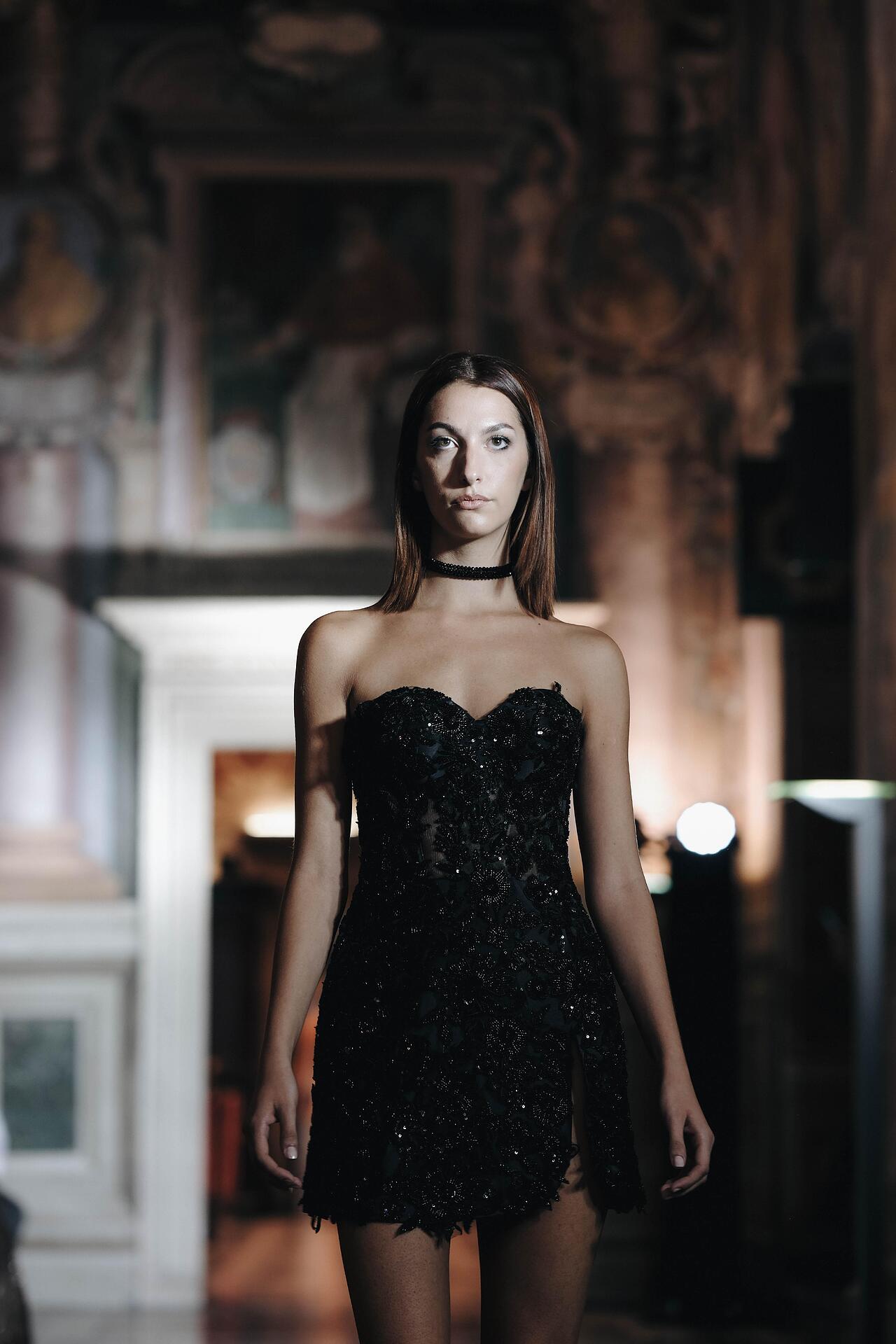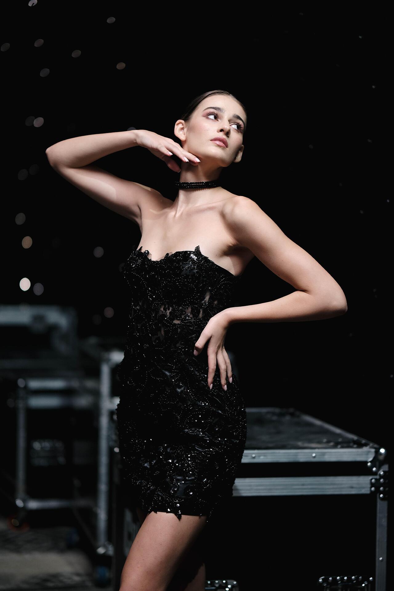 Задължителното бижу – малка черна рокля, но още по-луксозна и блестяща! Роклята е корсетна, с твърди чашки. Има прилепнал къс силует, който подчертава фигурата. Горната част е със сърцевидно деколте , а цялата рокля е ръчно нашита с черни мъниста, пайети и кристалчета. Може да се изработи според мерките на клиента.