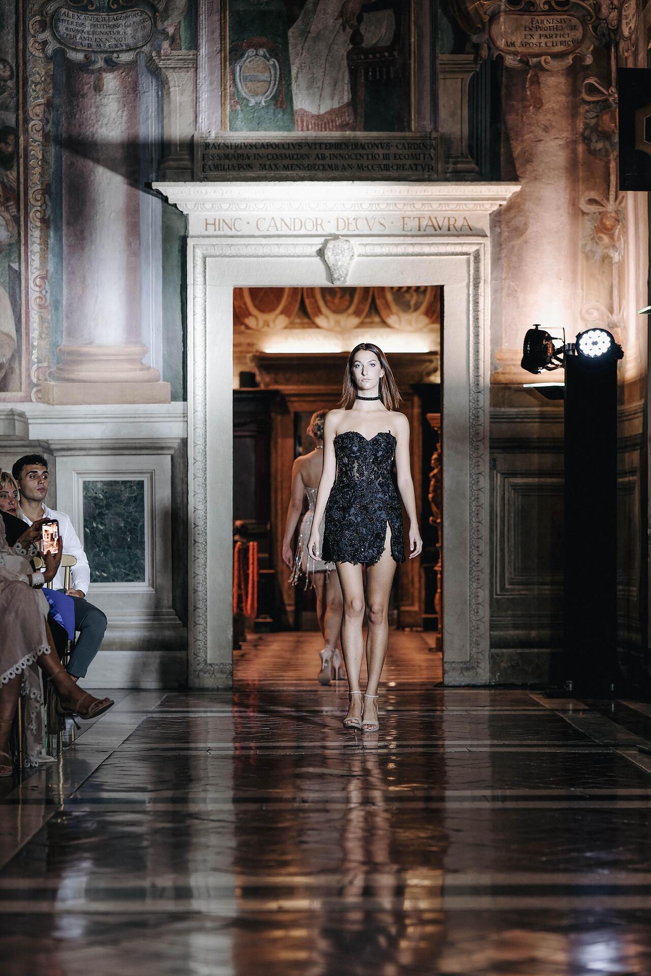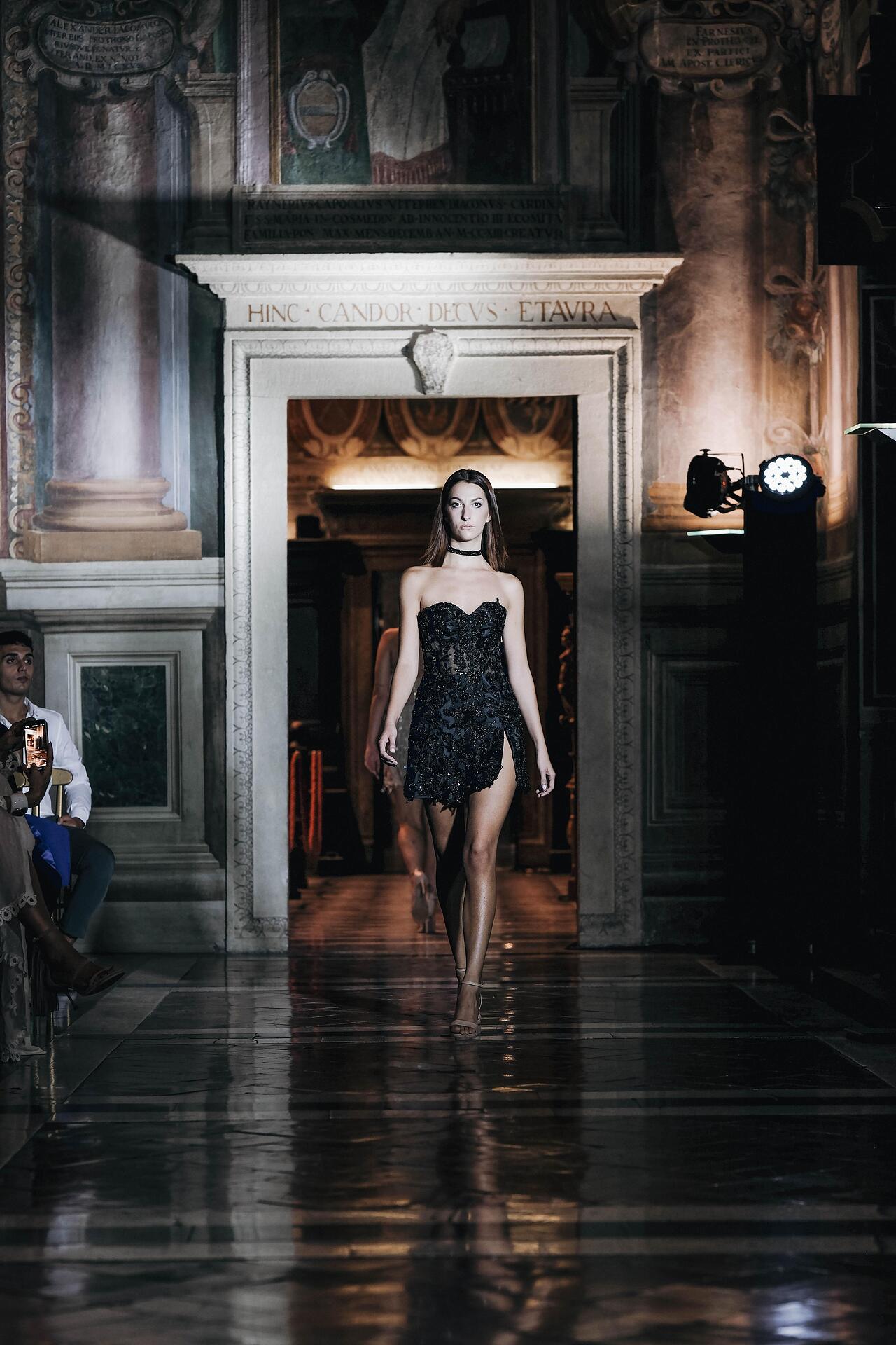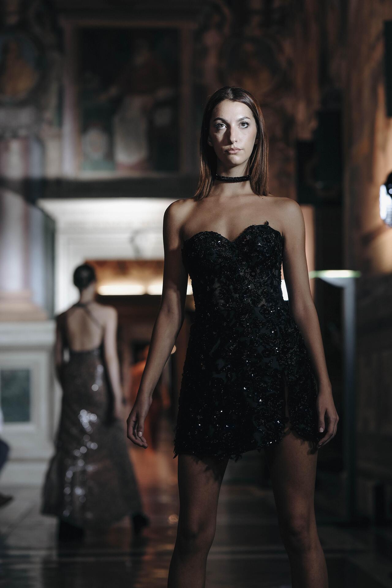 Задължителното бижу – малка черна рокля, но още по-луксозна и блестяща! Роклята е корсетна, с твърди чашки. Има прилепнал къс силует, който подчертава фигурата. Горната част е със сърцевидно деколте , а цялата рокля е ръчно нашита с черни мъниста, пайети и кристалчета. Може да се изработи според мерките на клиента.