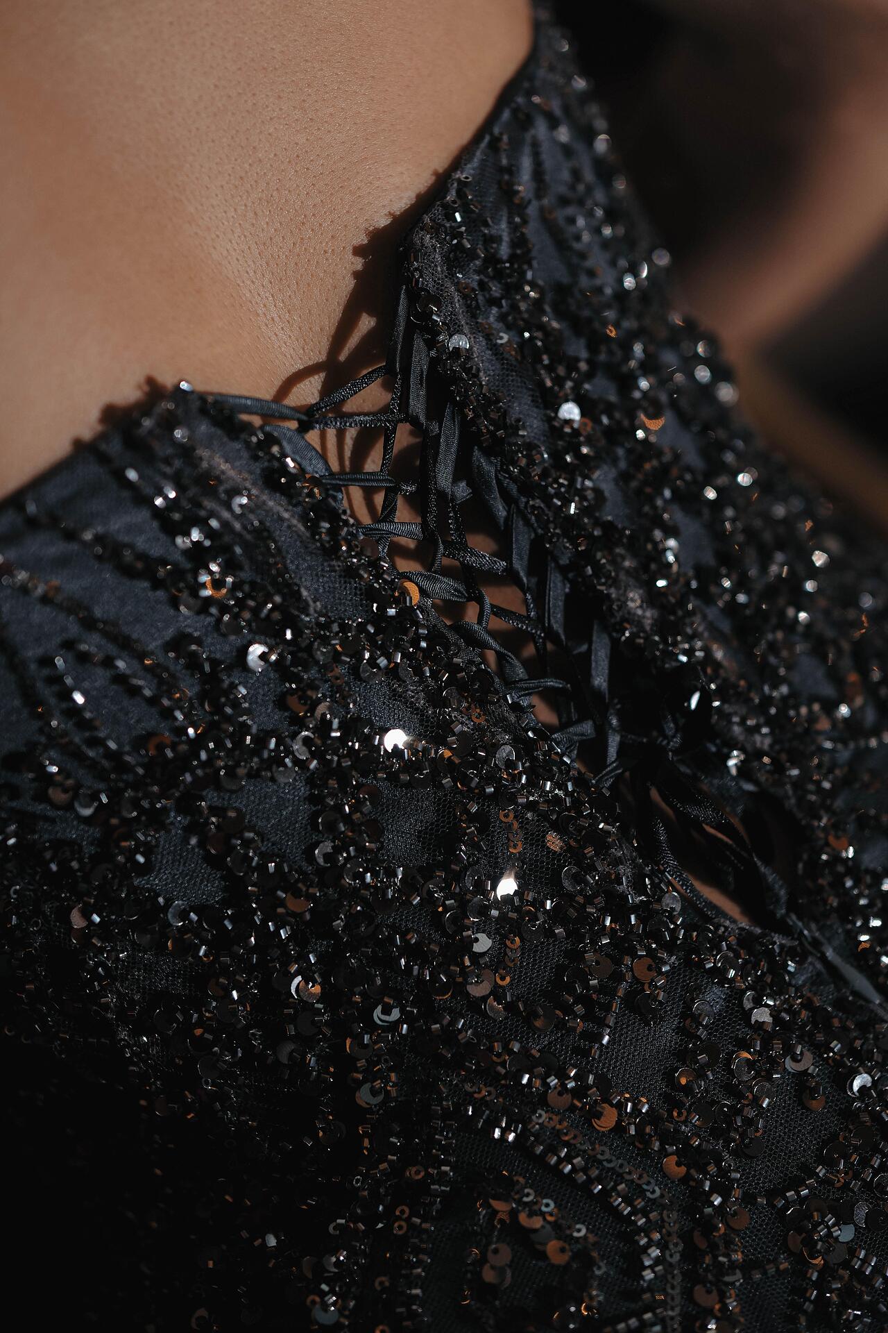 Блясък при всяко движение - това е рокля Tifani. С мека подплата, която стига малко над средата на бедрото за комфортно усещане през цялата вечер. Горният пласт на роклята е полупрозрачен мрежест плат с изящни флорални блестящи детайли. Роклята е изключително удобна за носене и поради наличието на регулиращи се връзки отзад на гърба и вградените чашки.
