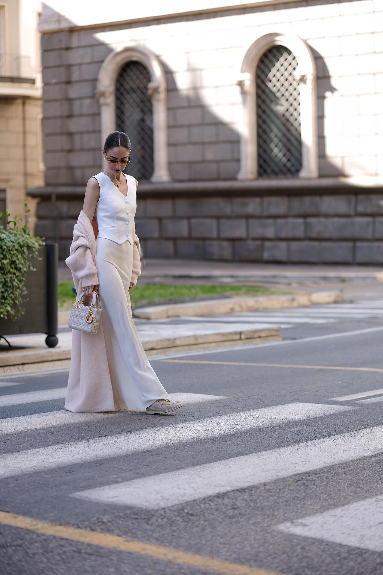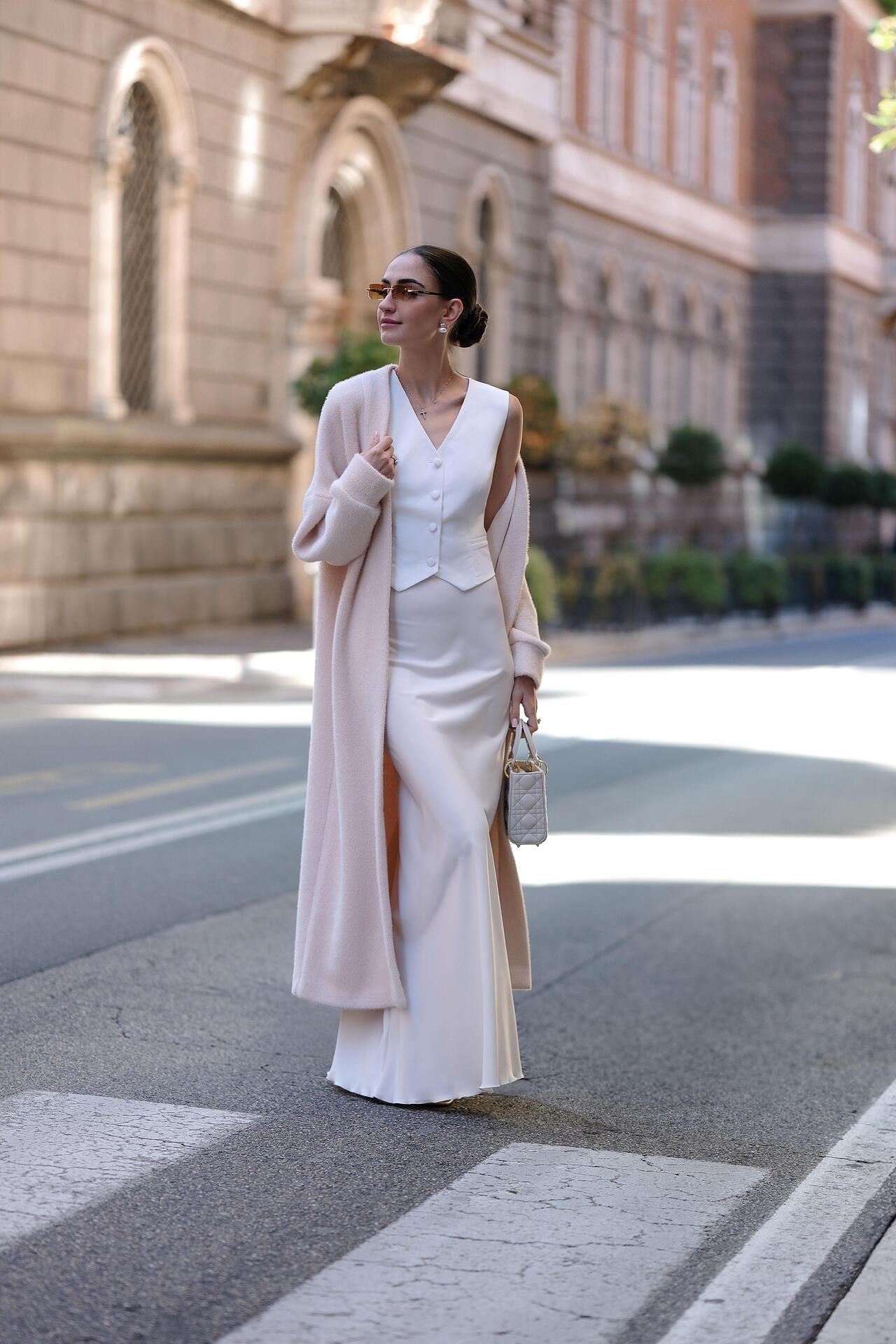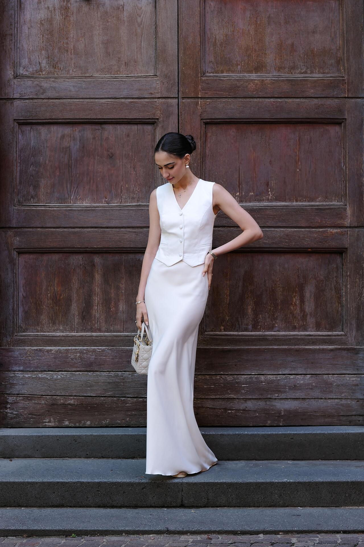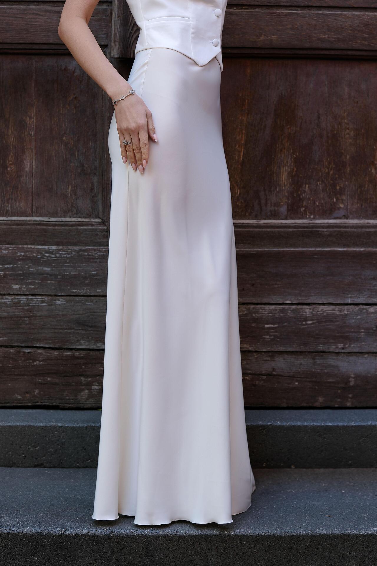 Пола със свободна кройка и дължина до земята, изработена от копринен сатен, придаващ изтънчен блясък и лекота. Лесно се съчетава както с ежедневни визии, така и за по-официални поводи. Много е удобна за носене и не ограничава движението на краката. Отстрани се закопчава с цип.