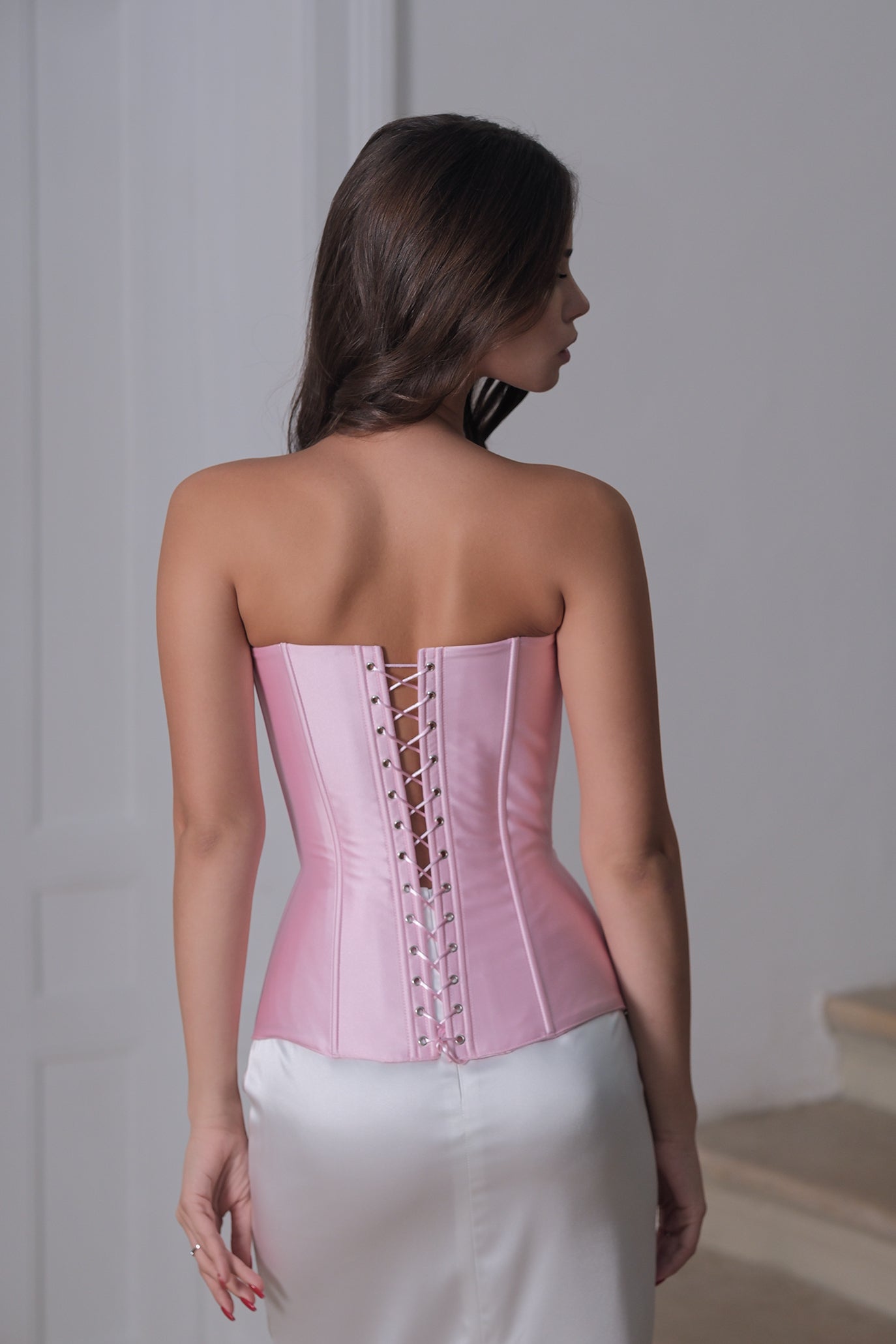 Изработен от висококачествени материали - плътен сатен. Придържа добре бюста и се завързва с връзки, които се намират отзад на гърба. Корсетът е създаден с прецизни вертикални банели, които не само подчертават талията, но и осигуряват изключителен комфорт и опора. Дизайнът с изчистено деколте придава модерна и минималистична визия, идеална за стилни и уверени жени.