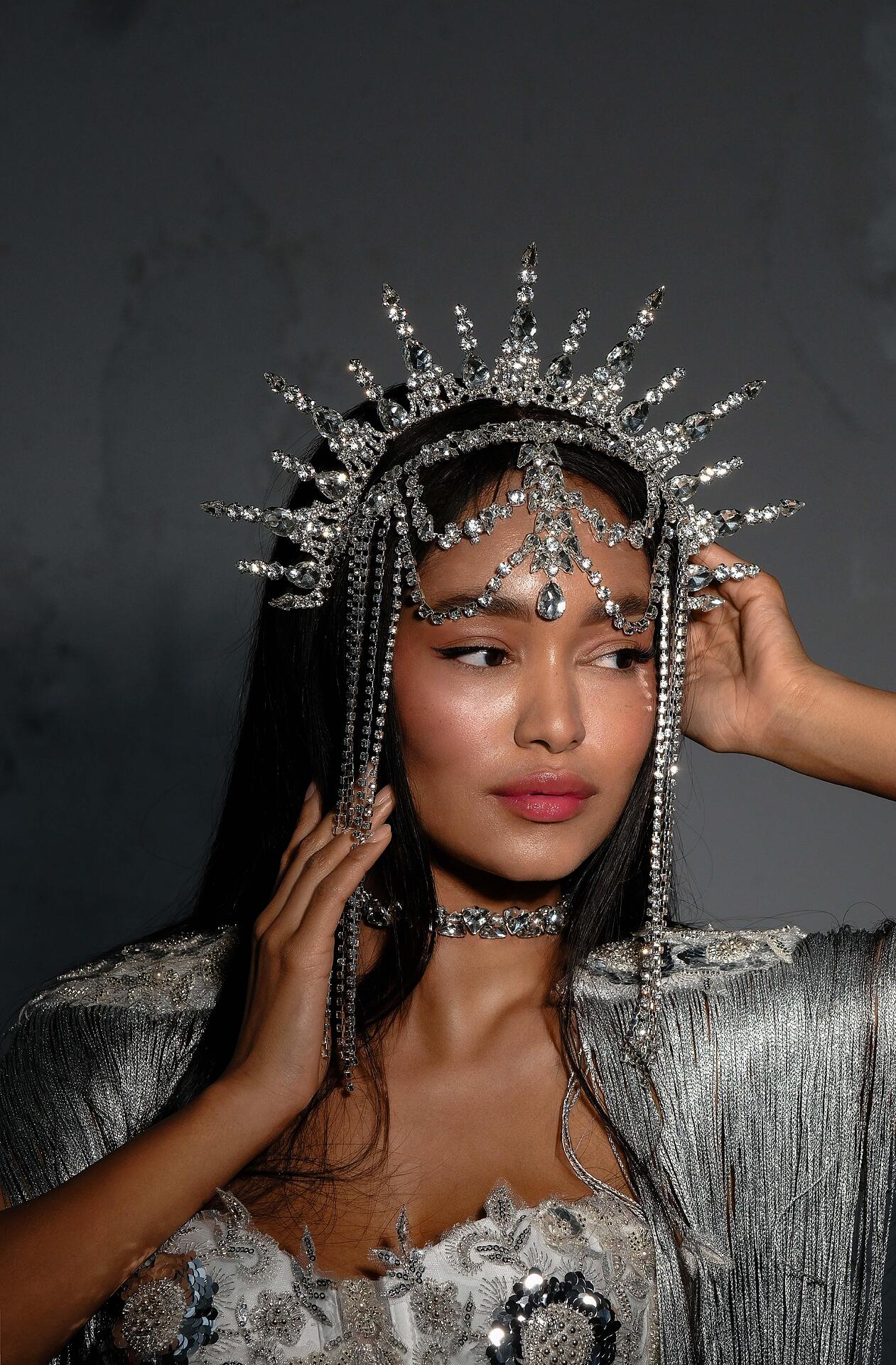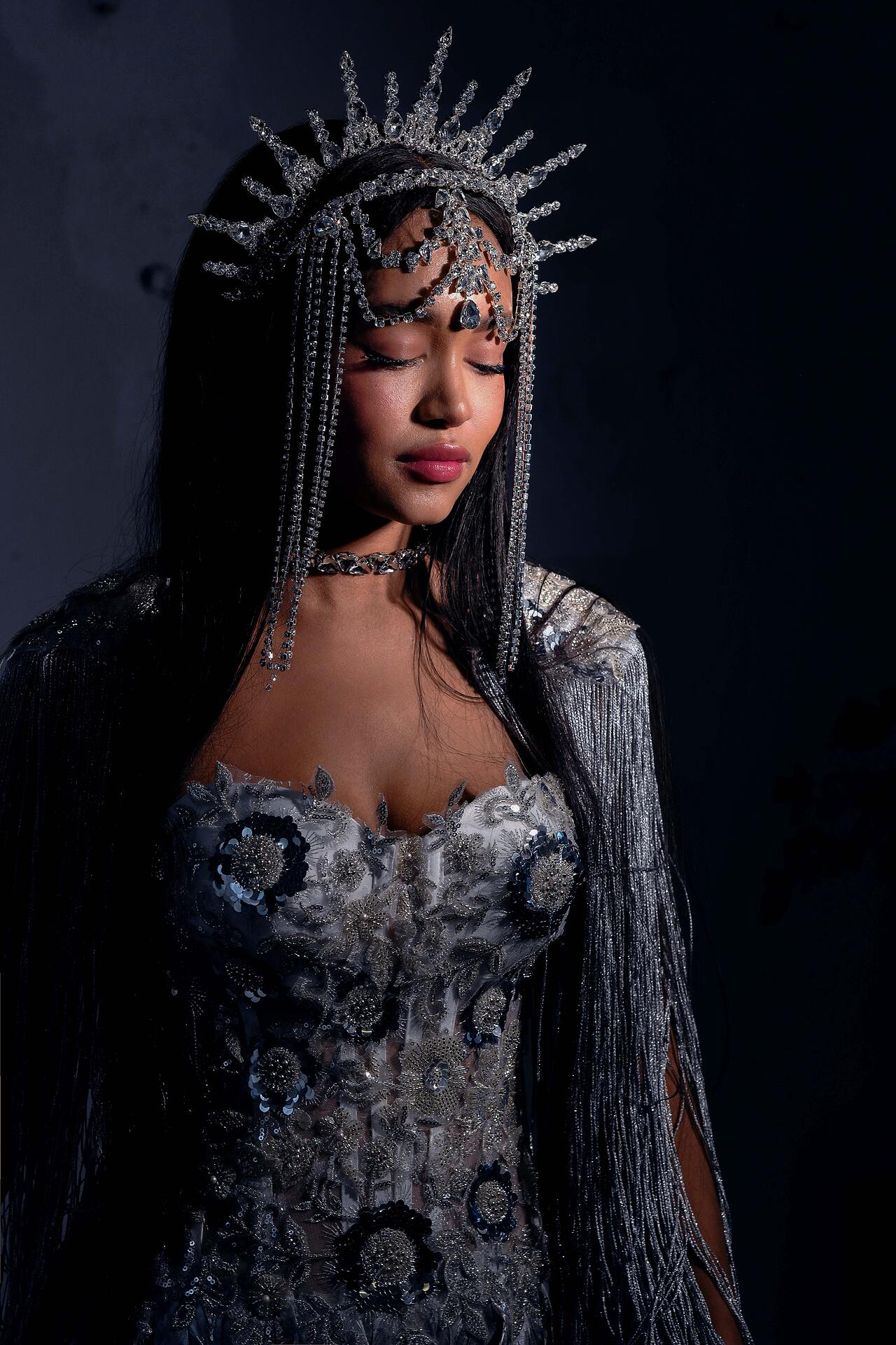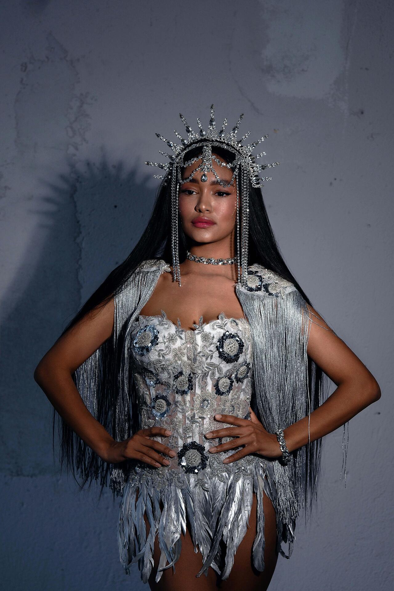 Уникална дизайнерска рокля от 3 части: корсет, аксесоар за рамене и пола(която се изработва според мерките на клиента). Ръчно нашит корсет със сребристи мъниста, пайети и кристалчета, корсетът е с твърди чашки. Аксесоари за рамене с бродерии от зластисти пайети и дълги висящи текстилни нишки. Полата е с естествени златисти пера. Всичко е изработено от висококачествени материали.