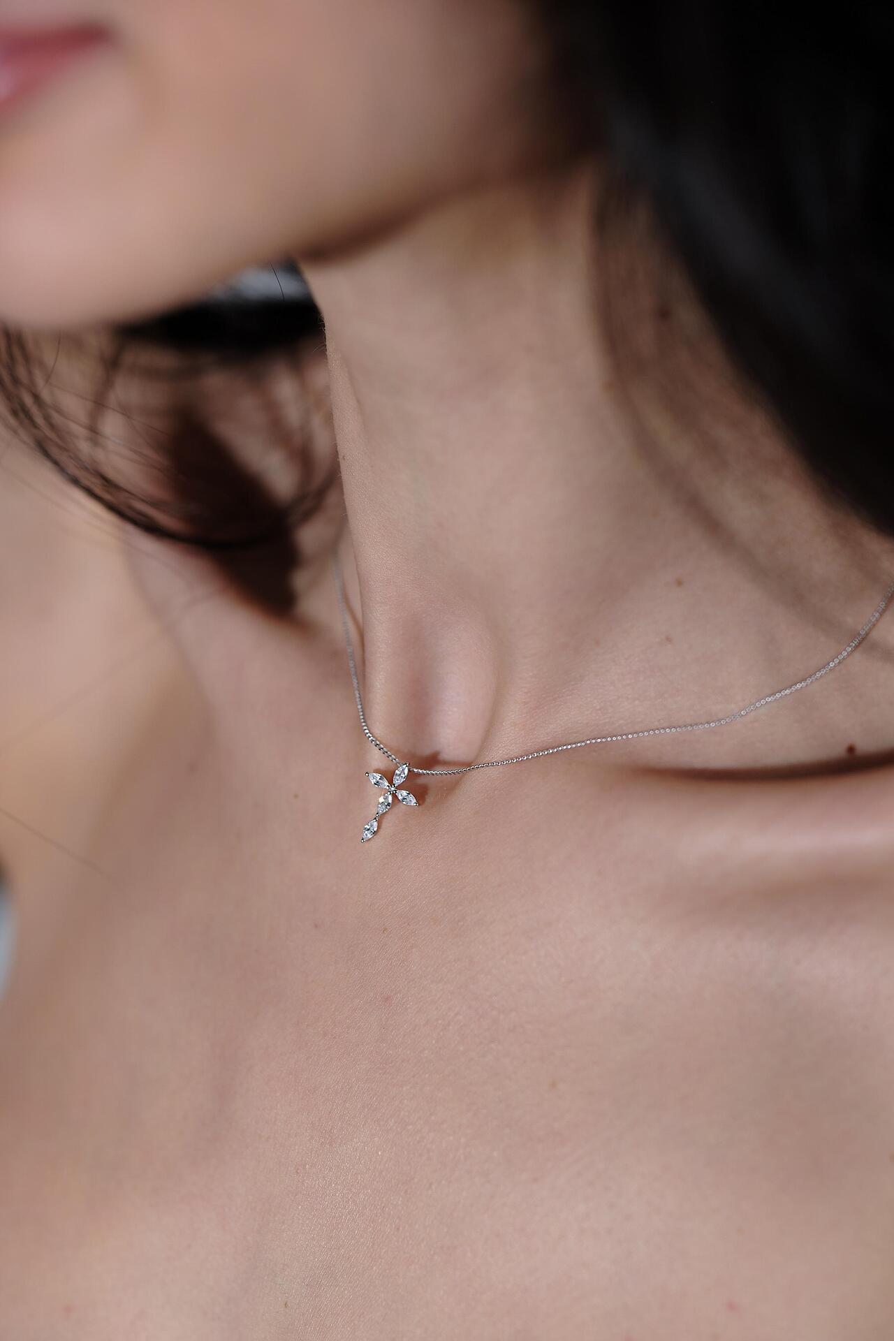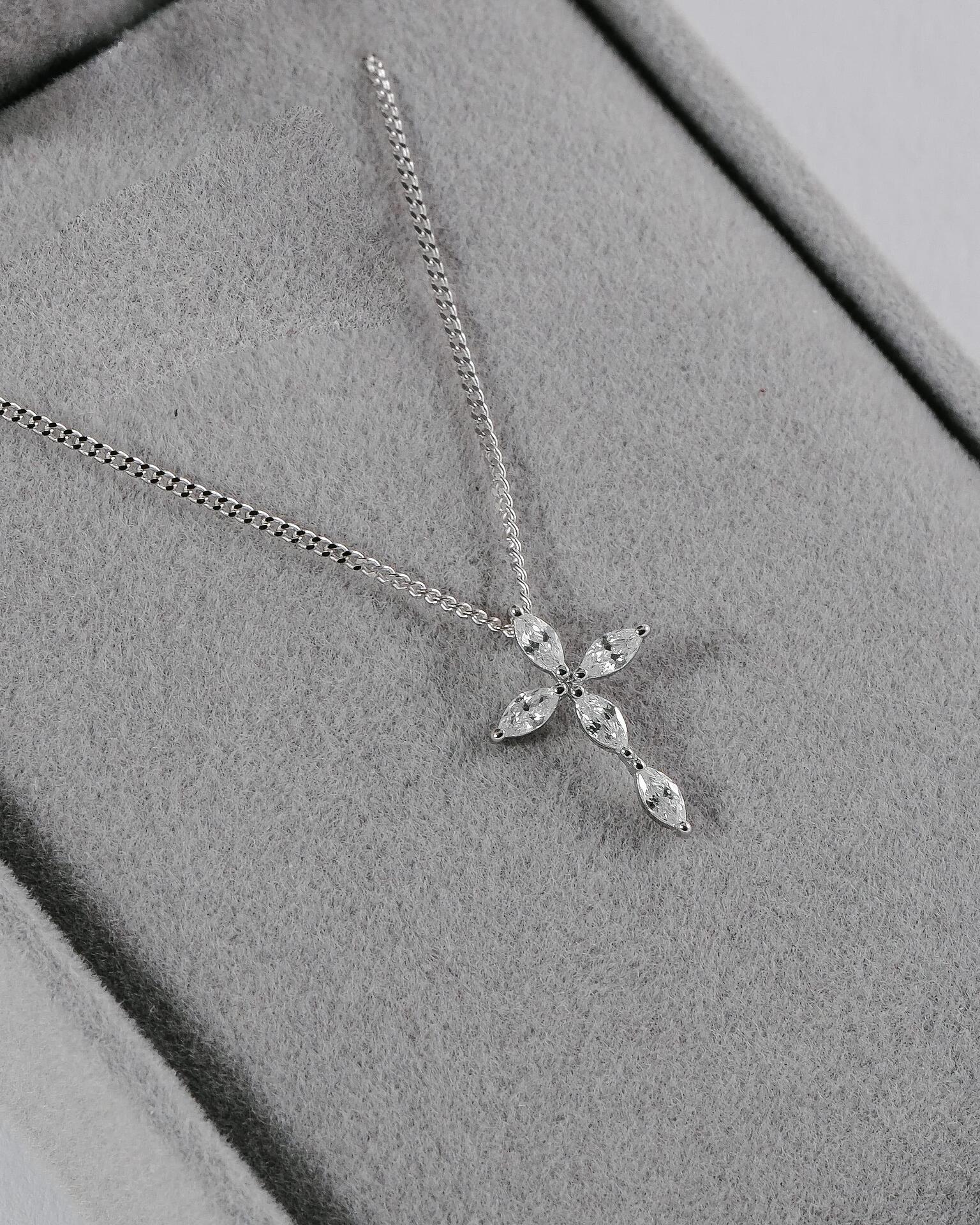 Сребърно колие с висулка във формата на кръст, който е декориран с блестящи малки камъчета. Бижуто се доставя в луксозна кутийка, която е включена в цената.