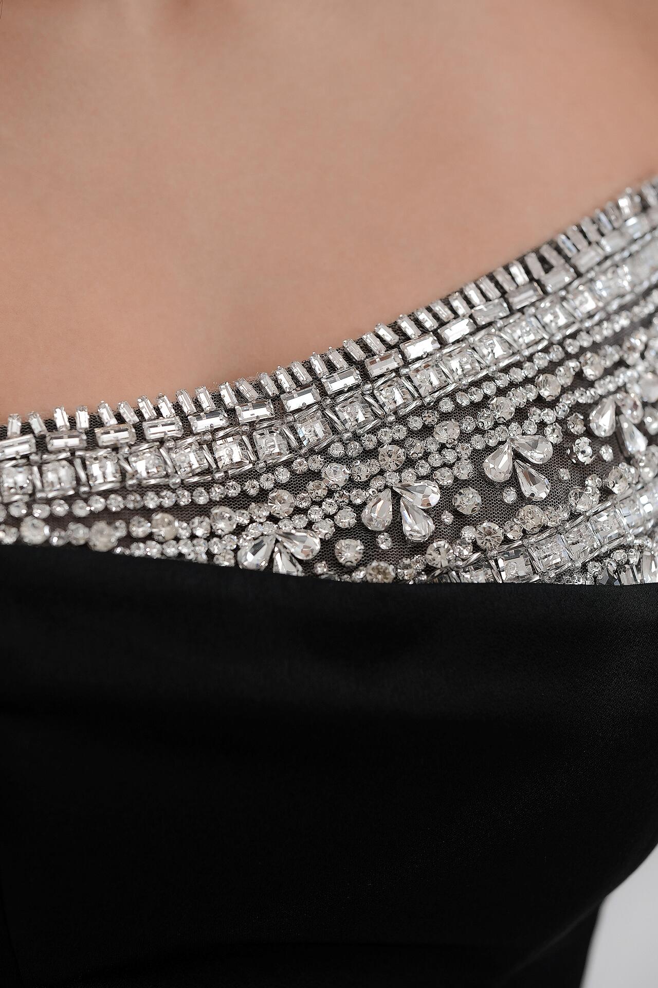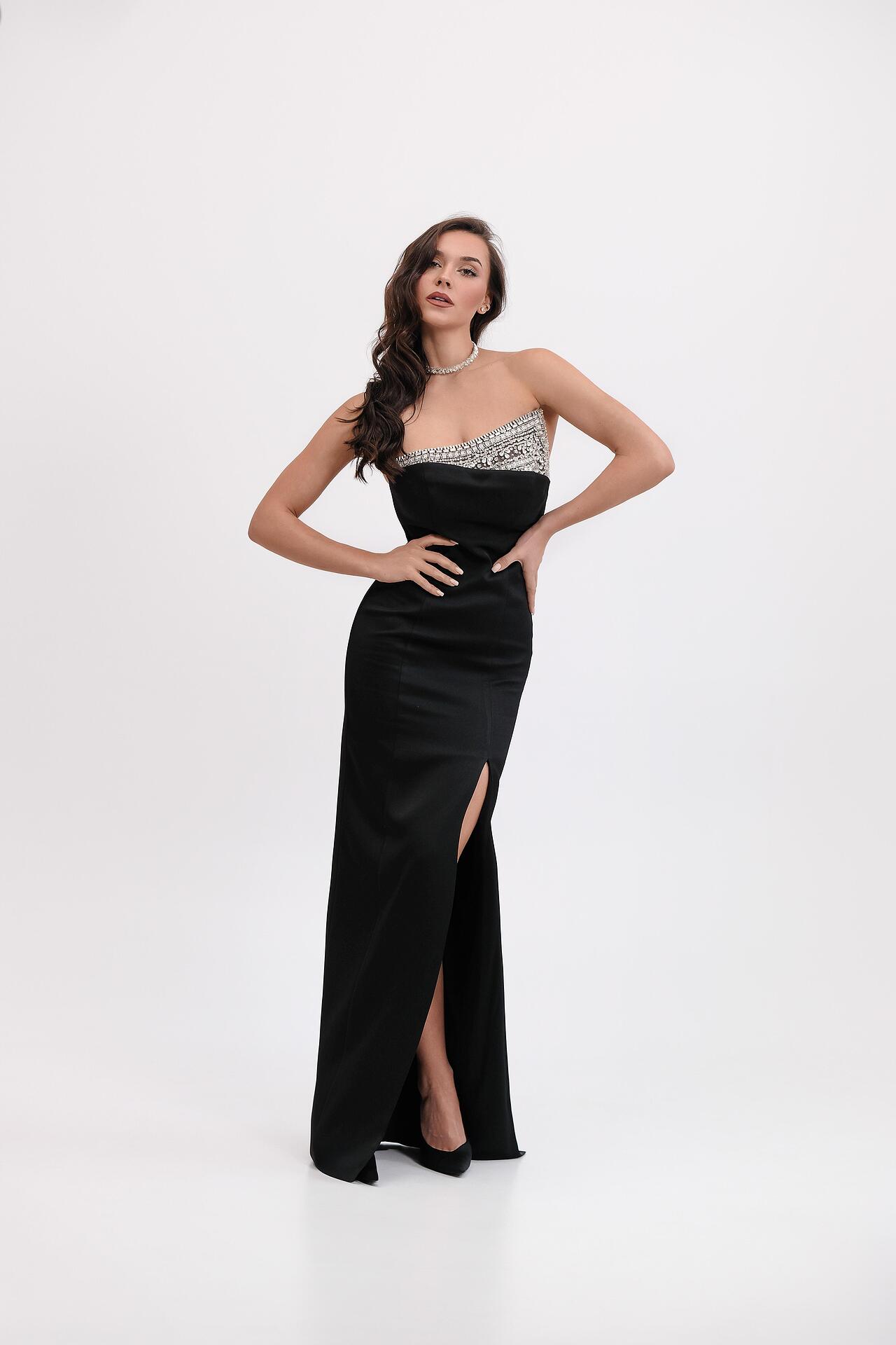 Елегантна рокля с асиметрично деколте. Горната част е оформена в асиметрична форма, украсен с ръчно нашити кристали. Плътната материя красиво обгръща фигурата, подчертавайки извивките. Долната част е със странична цепка, която придава привлекателност и позволява свобода на движенията, а вталената кройка създава силует, който впечатлява. Отзад се закопчава с цип.